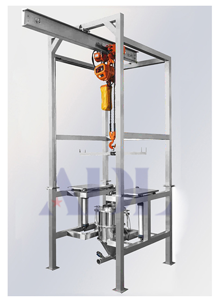 吨包投料站通过电动葫芦将吨袋提升至设备进料口正上方处,由人工固定吨袋内袋于设备夹袋口,通过